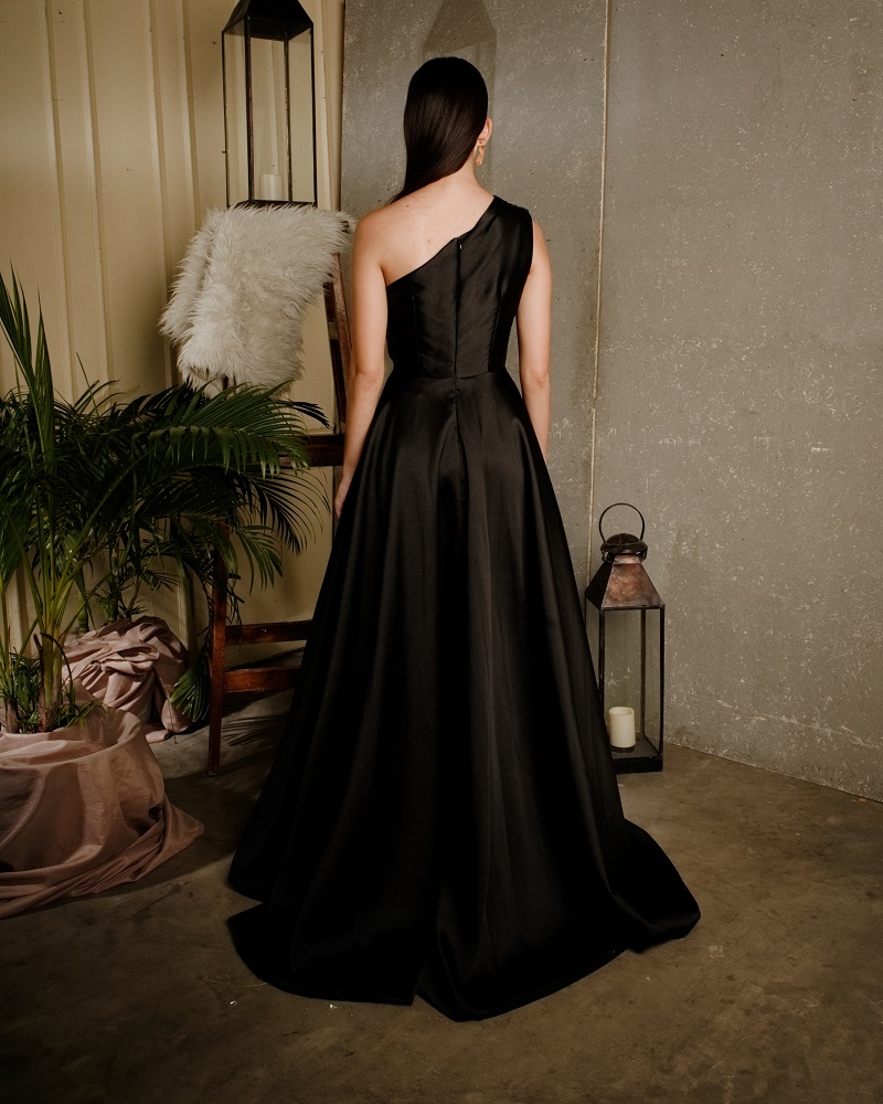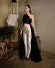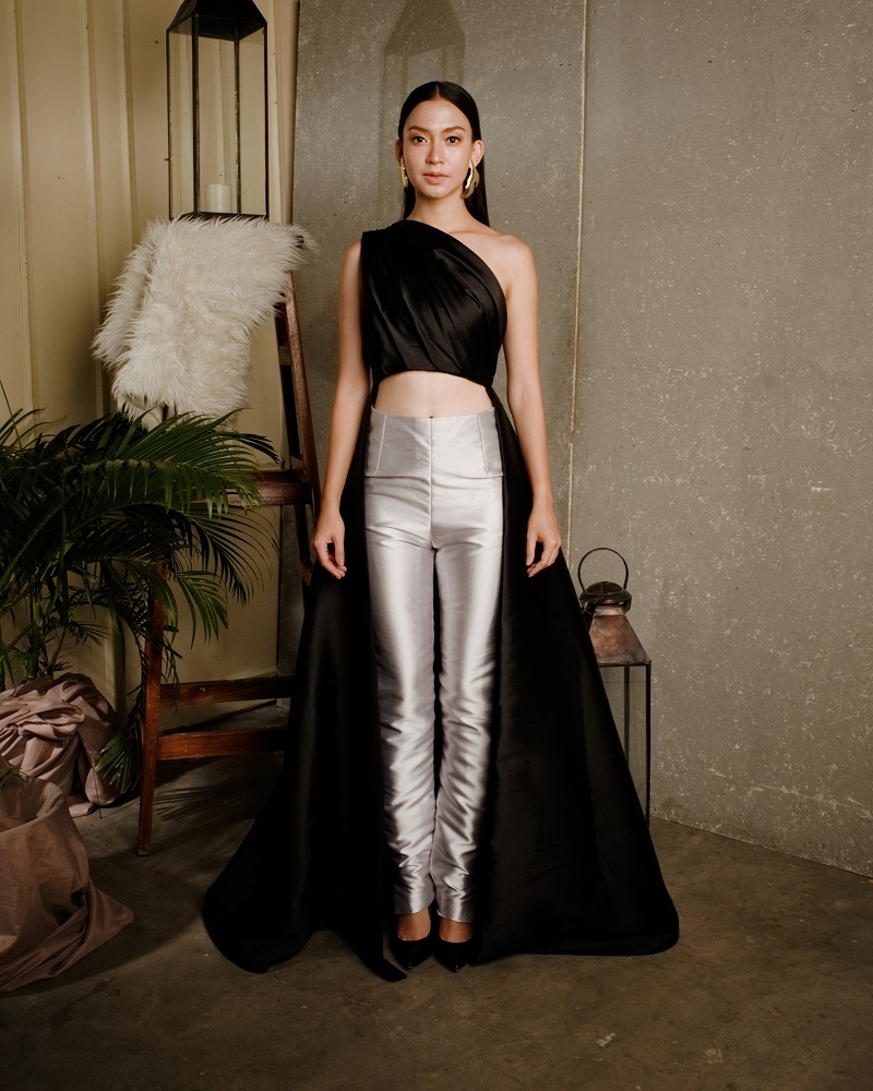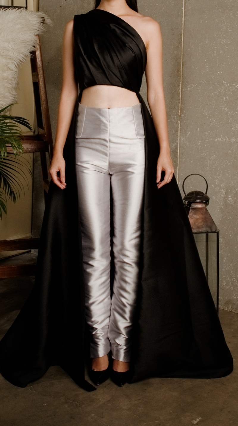 Perpaduan antara celana panjang dan one shoulder dress bakal membuat pemakainya menjadi pusat perhatian.